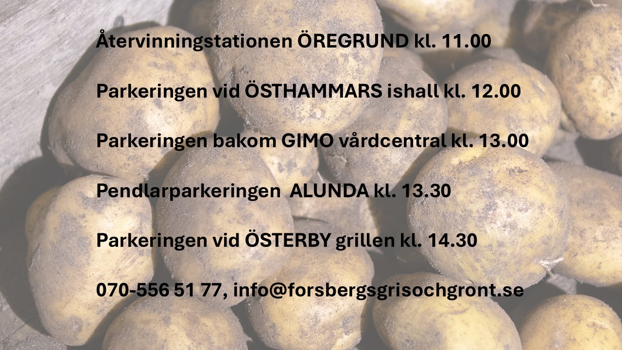 Vi gör en extra utkörning den 22 februari. Ni kan beställa via hemsida, mejl eller sms och möta upp mig på följande platser (se bild). Ni får en bekräftelse av mig på något sätt och ni betalar på plats via swish eller kontant.
